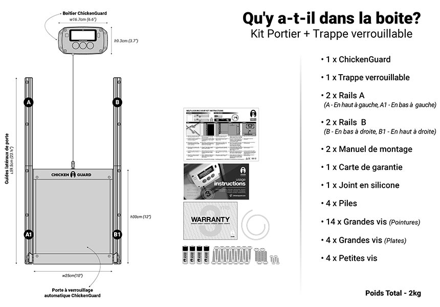 Ce kit Premium Combo facile d’utilisation a été conçu pour protéger efficacement vos poules des prédateurs et vous offrir la sérénité. Composé de notre portier poulailler automatique le plus vendu, le boîtier Premium ChickenGuard©, et de notre porte autobloquante, vos poules peuvent se prélasser au lit en toute sécurité lorsque vous êtes en soirée et vous pouvez en faire de même lorsqu’elles sont de sortie. Nous savons à quel point vos poules sont importantes pour vous. Elles le sont pour nous aussi et nous sommes convaincus qu’une fois le kit Premium Combo installé, vous ne pourrez plus vous en passer.